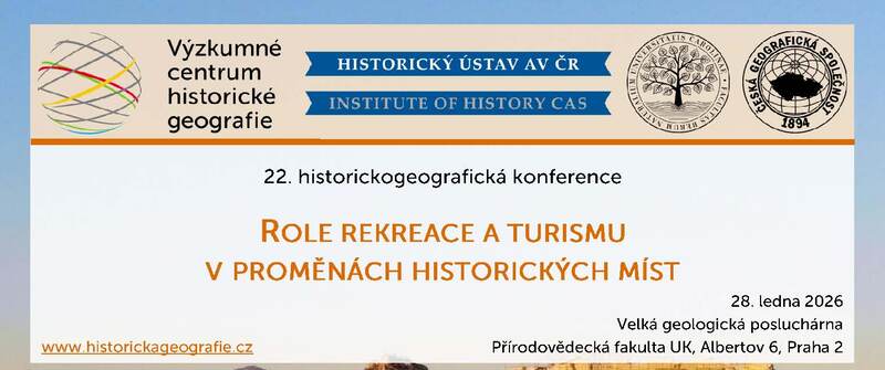 Jménem Výzkumného centra historické geografie a Sekce historické geografie a environmentálních dějin ČGS si Vás dovolujeme pozvat na již 22. historickogeografickou konferenci tentokrát s podtitulem „Role rekreace a turismu v proměnách historických míst“, která se bude konat tradičně poslední týden v lednu, ve středu 28. ledna 2026 ve Velké geologické posluchárně na Přírodovědecké fakultě Univerzity Karlovy (Albertov 6, Praha 2).