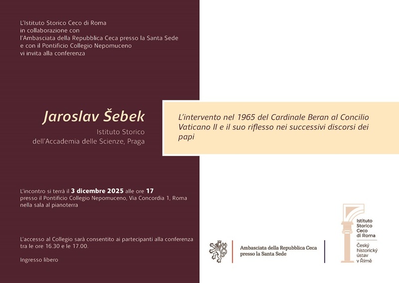 Český historický ústav v Římě ve spolupráci s Velvyslanectvím České republiky při Svatém stolci a Pontificio Collegio Nepomuceno Vás zve na přednášku L’intervento nel 1965 del Cardinale Beran al Concilio Vaticano II e il suo riflesso nei successivi discorsi dei papi doc. Jaroslava Šebka z Historického ústavu AV ČR, která se uskuteční 3. prosince 2025 od 17:00 v přednáškovém sále papežské koleje Nepomucenum (Via Concordia 1, Řím).